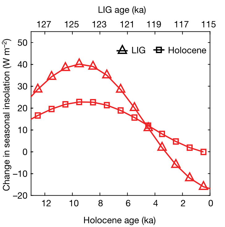 De Milanković-cycli zorgen voor geleidelijke veranderingen in die seizoenen. Op het noordelijk halfrond hebben we in de loop van het Holoceen iets minder zon gekregen in de zomer, door de cycli. En ook in de tropen wordt de hoeveelheid zonlicht net wat anders verdeeld over het jaar. De afbeelding hieronder uit het onderzoek van Bova illustreert dit. Die afbeelding laat zien hoe de hoeveelheid zonlicht in de tropen in de maanden juni t/m september is veranderd in de loop van het Holoceen en in het vorige interglaciaal (LIG; interglacialen verlopen niet allemaal identiek). In haar onderzoek spoort Bova de seizoensinvloed in proxy’s op en gaat ze na hoe groot de invloed ervan is op reconstructies. Haar resultaat komt verrassend goed overeen met dat van Osman. Na correctie voor de seizoensinvloed vindt zij een opwarming van een kwart van een graad over de afgelopen 6500 jaar.