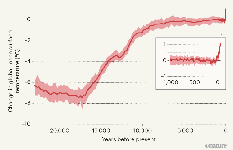 De afbeelding hierboven, uit een artikel van Ars Technica, is een geactualiseerde versie van die grafiek, gebaseerd op een deze maand verschenen temperatuurreconstructie van de afgelopen 24.000 jaar door onderzoekers van de Universiteit van Arizona. Eerste auteur is Matthew Osman. De periode omvat het hele Holoceen, maar ook de periode uit de laatste ijstijd waarin de ijskappen het grootst waren, het Laatste Glaciale Maximum (LGM).