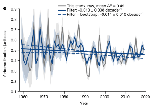 Het is een interessant artikel. Het is zaak om een goed beeld te krijgen van de koolstofcyclus. Het is maar de vraag of het begrip airbornfraction(abf) ons wel zo veel verder helpt. Het is slechts een verhoudingsgetal dat als je het over een langere periode bekijkt, bijvoorbeeld van 1750 tot heden redelijk nutteloos lijkt. De eerste 100 jaar was het soms ver boven de 1 en in de dertiger jaren van de 20stigste eeuw was het onder nul. Dat maakt het nutteloos al is het nog zo gangbaar. Er zijn vinden processen plaats die vrijwel los van elkaar staan. Een groep van processen die het CO2-gehalte doen toenamen bijvoorbeeld emissies maar ook bosbranden en andere processen die biomassa omzetten in CO2 en een groep processen die de extra CO2 weer uit de atmosfeer onttrekken zoals uitregenen maar ook vorming van extra biomassa (fotosynthese aan zich is niet voldoende. De biomassa dient blijvend onttrokken te worden bijvoorbeeld door herbebossing). Het is denk ik beter om beide processen afzonderlijk te volgen. Want het gaat om extra CO2 toevoeging en onttrekking aan de atmosfeer maar de processen zijn gescheiden. Omvang van beide processen staan los van elkaar terwijl ABF deze twee zaken aan elkaar koppelt.