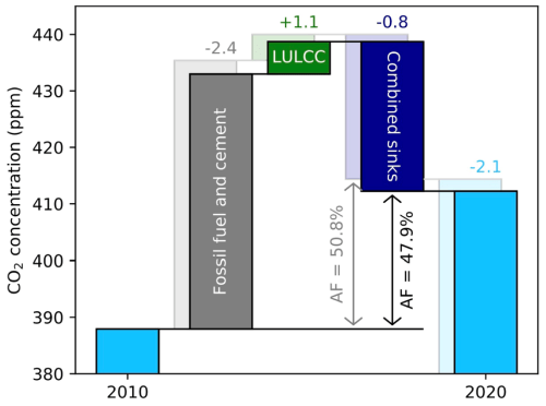Maar het blijft altijd de vraag in hoeverre die lokale of regionale studies ook representatief zijn voor de hele wereld. En juist om dat mondiale inzicht te krijgen is er een vrij simpele methode om iets te zeggen over de koolstofcyclus, en dan met name in hoeverre de natuurlijke opname veranderd is. Deze methode is gebaseerd op de zogenaamde airborne fraction en of die verandert in de tijd. De airborne fraction is het deel van onze totale uitstoot die in de atmosfeer blijft zoals eerder besproken in een gastblog van mij. Voor het bepalen daarvan heb je de CO2-uitstoot van fossiele brandstoffen en ontbossing nodig, en de CO2-accumulatie in de atmosfeer: