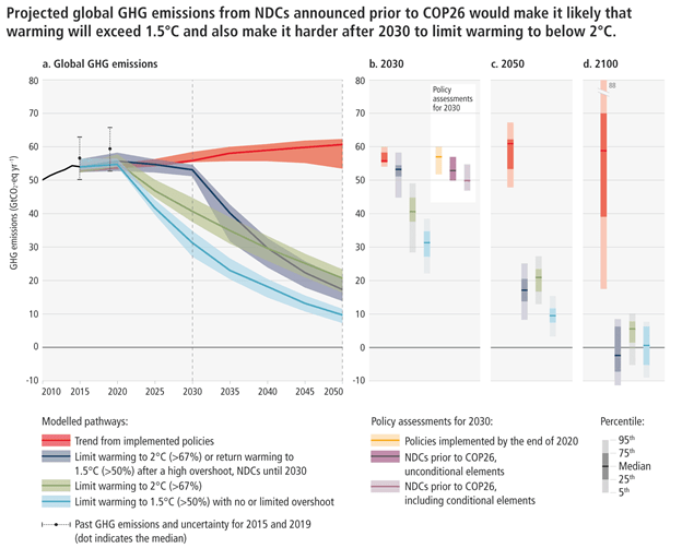 De huidige toezeggingen van landen over beperking van hun uitstoot zijn onvoldoende om de temperatuurstijging onder de 1,5 graden te houden. Zonder aanscherping van de huidige plannen stevent de wereld volgens het IPCC af op circa 3,2 graden opwarming in 2100.