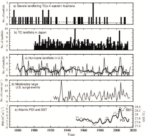 Binnen de Wereld Meteorologische Organisatie (WMO) is er een werkgroep die zich specifiek concentreert op onderzoek naar tropische cyclonen. Deze werkgroep heeft in 2019 een artikel (Knutson et al 2019) gepubliceerd in het blad van de American Meteorological Society. Zij hebben op basis van de data van NOAA in kaart gebracht hoe de ontwikkeling is geweest van het aantal tropische cyclonen op verschillende plekken op Aarde over verschillende seizoenen. Het onderste figuur is een overzicht van het Atlantische Power Dissipation Index, dit is een getal dat ons verteld hoeveel TC energie er in een bepaald seizoen zat. De SST staat voor sea surface temperature, wat de oppervlaktetemperatuur van het water inhoudt. Zie figuur 2 hieronder.
