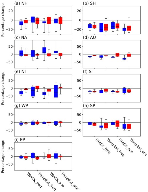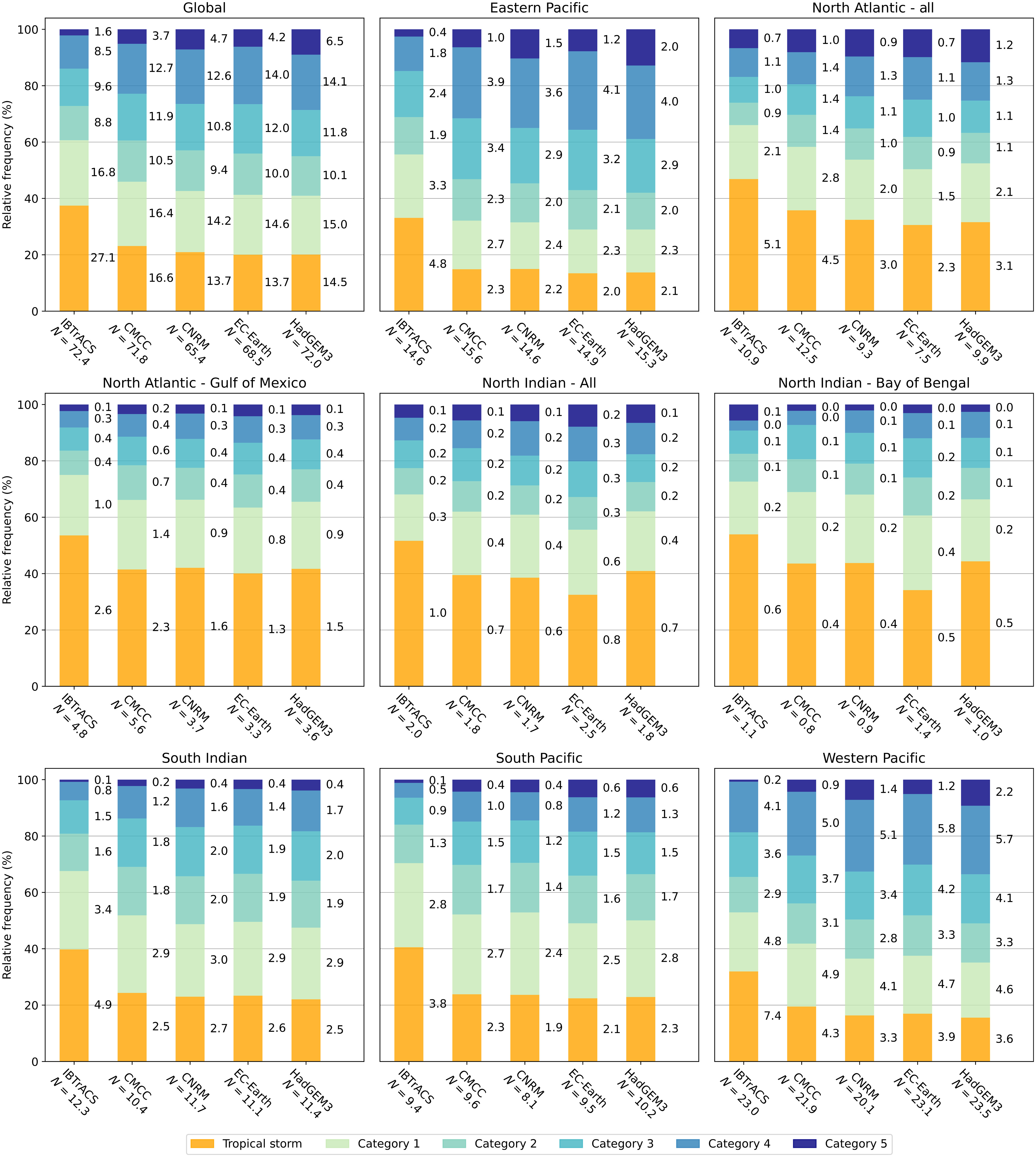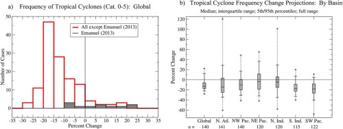 Terug naar het primaire vraagstuk: hoe gedragen TC’s zich in de verschillende bassins in een klimaat dat twee graden Celsius warmer is dan aan het einde van de 19e eeuw? Dezelfde onderzoeksgroep (Knutson et al 2020) heeft de gebruikte modellen van het IPCC AR5 geëvalueerd. Zie figuur 4 voor de resultaten over de frequentie van het aantal TC’s in een warmer klimaat.