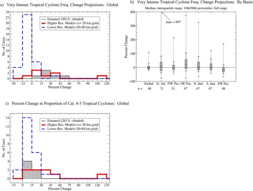 de resultaten voor de verandering van de frequentie van zeer intense TC’s (categorie 4 of 5) wordt voornamelijk gestuurd door de resultaten van de lage resolutie modellen, want de hoge resolutie modellen laten veelal een toename zien van van intense TC’s.