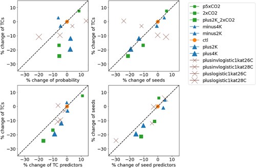De conclusie van Hseih et al (2020) was dat de verandering in het aantal TCs het beste beschreven wordt middels een verandering in het aantal zaadjes en een verandering in de genesis potential. Dit is ook te zien in Figuur 8, waar de geplotte punten in figuren 8c en 8d het dichtst bij de diagonale lijn liggen ten opzichte van de andere plots. Voor klimaatmodelleurs betekent dit vooral dat het proces van TC formatie dus een combinatie is van deze twee factoren, en we dus met beide rekening moeten houden in klimaatsimulaties.