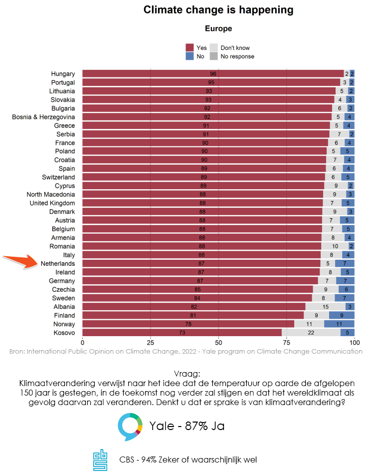 De uitslagen van de peilingen van Yale en het CBS rondom dit thema verschillen nogal. Opvallend in de peiling van Yale is ook hoe Nederland scoort in vergelijking met andere landen.