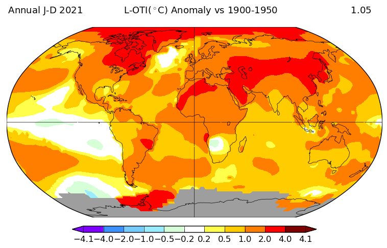 Er zijn lokale verschillen, daar is geen discussie over. Sommige van die verschillen, zoals de snelle opwarming van het noordpoolgebied, werden meer dan een eeuw geleden al voorspeld. Maar het kaartje hieronder, waarin de gemiddelde temperatuur van vorig jaar wordt vergeleken met die van de eerste helft van de vorige eeuw, laat zien dat het klimaat wereldwijd verandert.