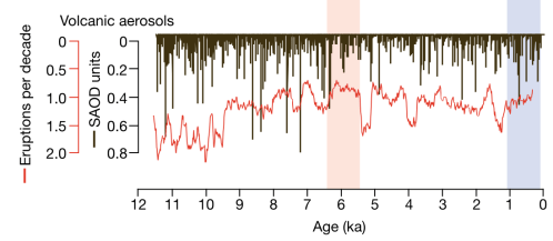 Variaties in de activiteit van de zon en van vulkanen kunnen ook invloed hebben op het klimaat. Volgens reconstructies hebben beide voor een minuscuul beetje afkoeling gezorgd in de periode van het mid-Holoceen tot aan de industriële revolutie. De invloed op variaties op kortere tijdschalen is wat groter. In de grafiek van vulkanische aerosolen hieronder staat de y-as weer op zijn kop, omdat meer vulkanische activiteit samengaat met een lagere temperatuur.