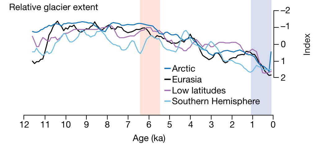 IJskappen hebben wel duizenden jaren nodig om te groeien en te krimpen. Vooral het groeien duurt erg lang, en de overgang van een interglaciaal naar een ijstijd gaat daardoor erg traag. De andere kant op gaat het iets sneller, maar toch waren de laatste resten van de ijskappen uit de laatste ijstijd op Eurazië en Noord-Amerika pas halverwege het Holoceen verdwenen. De overgebleven ijskappen van Groenland en Antarctica waren in de volgende millennia behoorlijk stabiel, tot aan de industriële tijd. Berggletsjers zijn wel gegroeid, zoals te zien is in de grafiek hieronder. De schaalverdeling van de y-as is daar omgekeerd, dus een dalende lijn staat voor groei van de gletsjers (en dus een afkoeling van het klimaat).