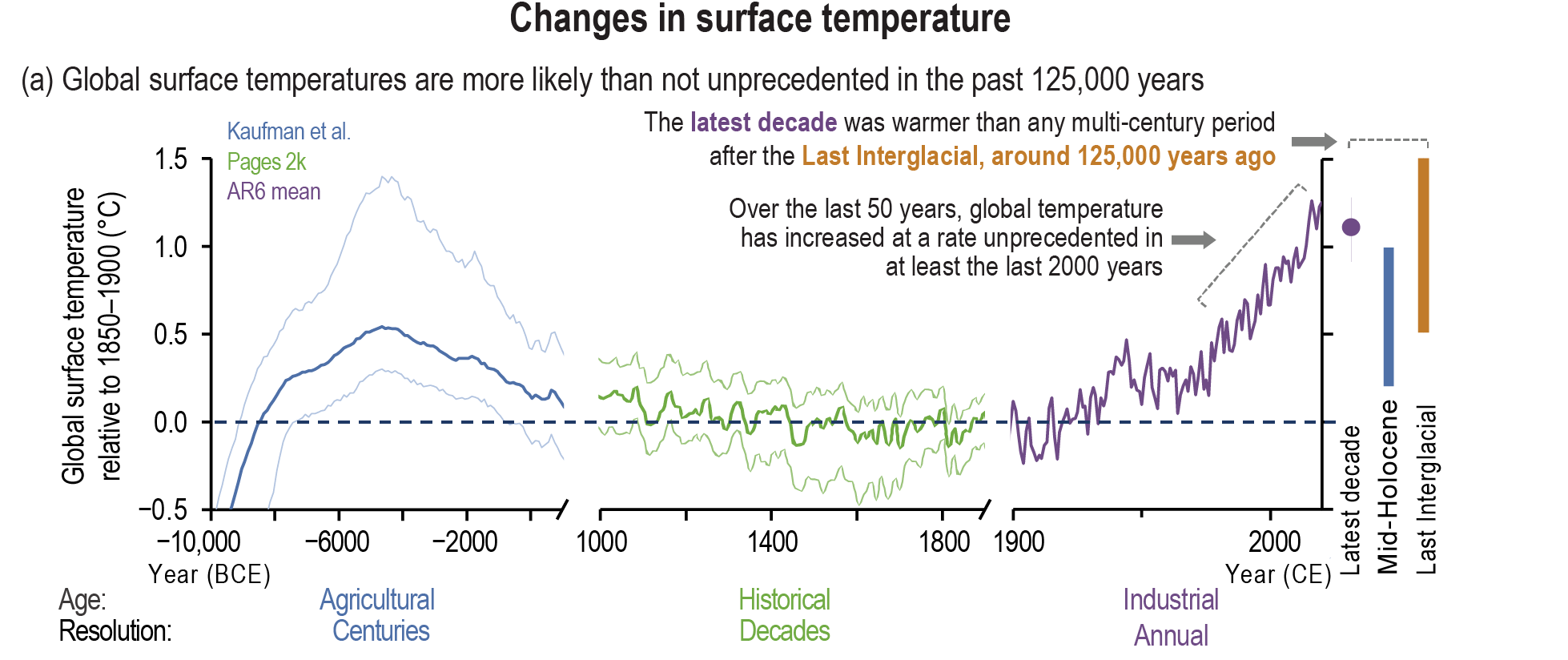 Dit stuk gaat over een artikel in Nature met de titel: ‘Revisiting the Holocene global temperature conundrum’. Die titel zou de indruk kunnen wekken dat het temperatuurverloop gedurende het Holoceen nog een groot raadsel is. In werkelijkheid valt dat best mee. De grote lijn van dat temperatuurverloop is bekend. Het Holoceen, het huidige interglaciaal, begon 11.700 jaar geleden met een laatste stukje opwarming vanuit de laatste ijstijd (het Weichselien, ook wel Würm genoemd en in de VS Wisconsinan): zo’n 2 tot 3 °C. Die opwarming zat vooral aan het begin: 9.000 jaar geleden was de temperatuurstijging al aardig afgevlakt. Aan het eind van het Holoceen zit de snelle antropogene opwarming, inmiddels ongeveer 1,2 °C in anderhalve eeuw. Daar tussenin is de gemiddelde wereldtemperatuur redelijk constant. Maar niet helemaal constant.