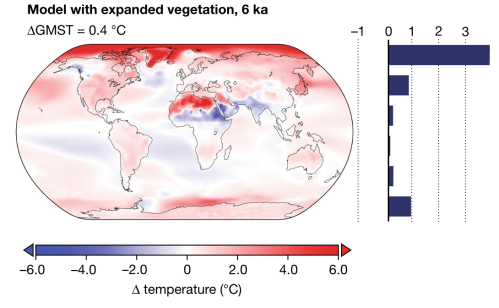 Vegetatie speelt vermoedelijk ook een rol van betekenis. Tot voor kort werden in de paleoklimatologie vooral gekoppelde atmosfeer-oceaanmodellen gebruikt. Het effect van klimaatveranderingen op vegetatie en de terugkoppeling daarvan op het klimaat is geen onderdeel van die modellen. Moderne aardsysteemmodellen nemen het wel mee en dat levert een resultaat op dat aanzienlijk dichter in de buurt komt van reconstructies. In elk geval voor wat betreft de gemiddelde wereldtemperatuur. Vegetatie is vaak donkerder dan de omgeving, waardoor er meer zonlicht wordt geabsorbeerd. Aardsysteemmodellen zien een aanzienlijke invloed op de temperatuur van het mid-Holoceen in onder meer het noordpoolgebied (waar het effect wordt versterkt door de terugkoppeling van sneeuw en ijs) en Noord-Afrika (de Sahara, die toen geen woestijnklimaat had). Mogelijk had de vegetatie ook invloed op de hoeveelheid mineraal stof in de lucht. Uit onderzoek van ijskernen blijkt dat die in het mid-Holoceen kleiner was dan in de periode daarna.