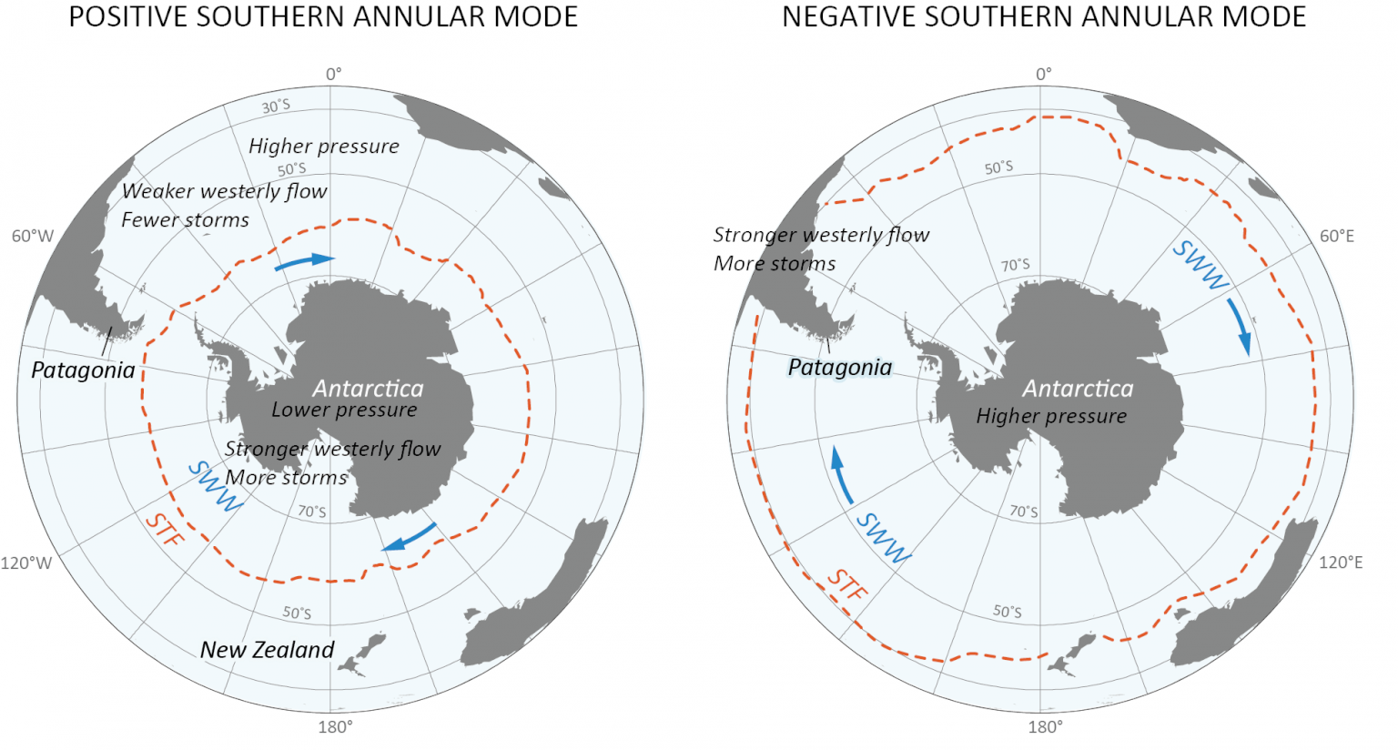 De afbeelding hierboven laat zien dat de SAM sinds het midden van de vorige eeuw gemiddeld is verschoven naar meer positieve waarden. Het gat in de ozonlaag wordt gezien als hoofdoorzaak van die verandering, maar waarschijnlijk spelen er meer factoren mee. De opwarming van het klimaat heeft vermoedelijk ook invloed. En volgens een reconstructie vertoonde de SAM de afgelopen duizend jaar ook een aanzienlijke natuurlijke variabiliteit op langere tijdschalen. Maar de huidige, overwegend positieve toestand is in die periode niet eerder voorgekomen. De mate waarin verschillende factoren hebben bijgedragen aan de verandering in de afgelopen decennia is niet heel nauwkeurig vast te stellen. En dus is er ook onzekerheid over hoe de SAM zich in de toekomst zal ontwikkelen. Door het herstel van de ozonlaag zal de toestand vaker negatief worden. En mocht natuurlijke variabiliteit bijgedragen hebben aan de overwegend positieve SAM, dan zal dat ooit ook weer de andere kant op gaan. De opwarming van het klimaat zou de SAM wel weer meer naar de positieve kant kunnen duwen. Wel is duidelijk dat de SAM de opwarming van Antarctica wat heeft afgeremd. Maar of dat ook in de toekomst het geval zal blijven, is onzeker.