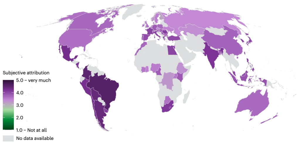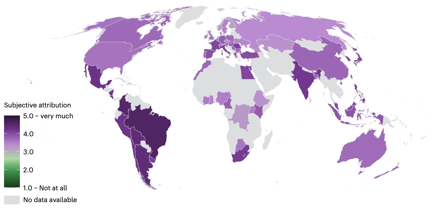 Subjectieve attributie is bovendien vooral hoog in landen in Latijns Amerika. De auteurs leggen uit dat mensen in Latijns Amerika ook relatief vaker aangeven dat klimaatverandering hunzelf en hun toekomstige generaties schade zal toebrengen, en ook dat de overtuiging van menselijke klimaatverandering daar hoog is. Bovendien geeft een groot deel van de respondenten aan persoonlijke ervaringen met extreem weer te hebben.