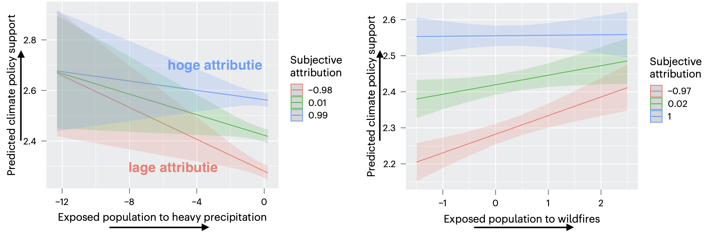 Dat laatste zou kunnen suggereren dat blootstelling aan klimaatextremen misschien ook steun voor klimaatbeleid aanwakkert, maar zo simpel blijkt dat toch niet te zijn. De resultaten laten namelijk zien dat blootstelling aan extreem weer niet direct is gelinkt aan meer steun voor klimaatbeleid: voor vijf van de zeven types extreem weer is er geen significante correlatie gevonden. Specifiek voor mensen met een lage subjectieve attributie neemt steun voor klimaatbeleid echter wel iets toe, bij blootstelling aan droogte, overstromingen en bosbranden. Voor mensen met een hoge subjectieve attributie geldt dit niet, waarschijnlijk omdat steun voor beleid al relatief hoog is.