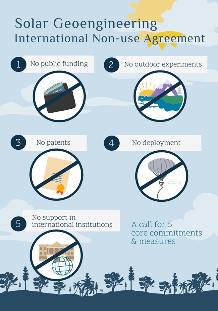 Dat we op dit moment geen SRM in moeten zetten is iets waar alle serieuze wetenschappers het over eens zijn. Dat er grote risico’s aan verbonden zijn staat ook niet ter discussie. De vraag is wel of je het bij voorbaat helemaal uit moet sluiten. En of dat aanleiding zou moeten zijn om ook onderzoek hiernaar, of op zijn minst experimenten in de atmosfeer, zou moeten verbieden. Daarover verschillen wetenschappers van mening.