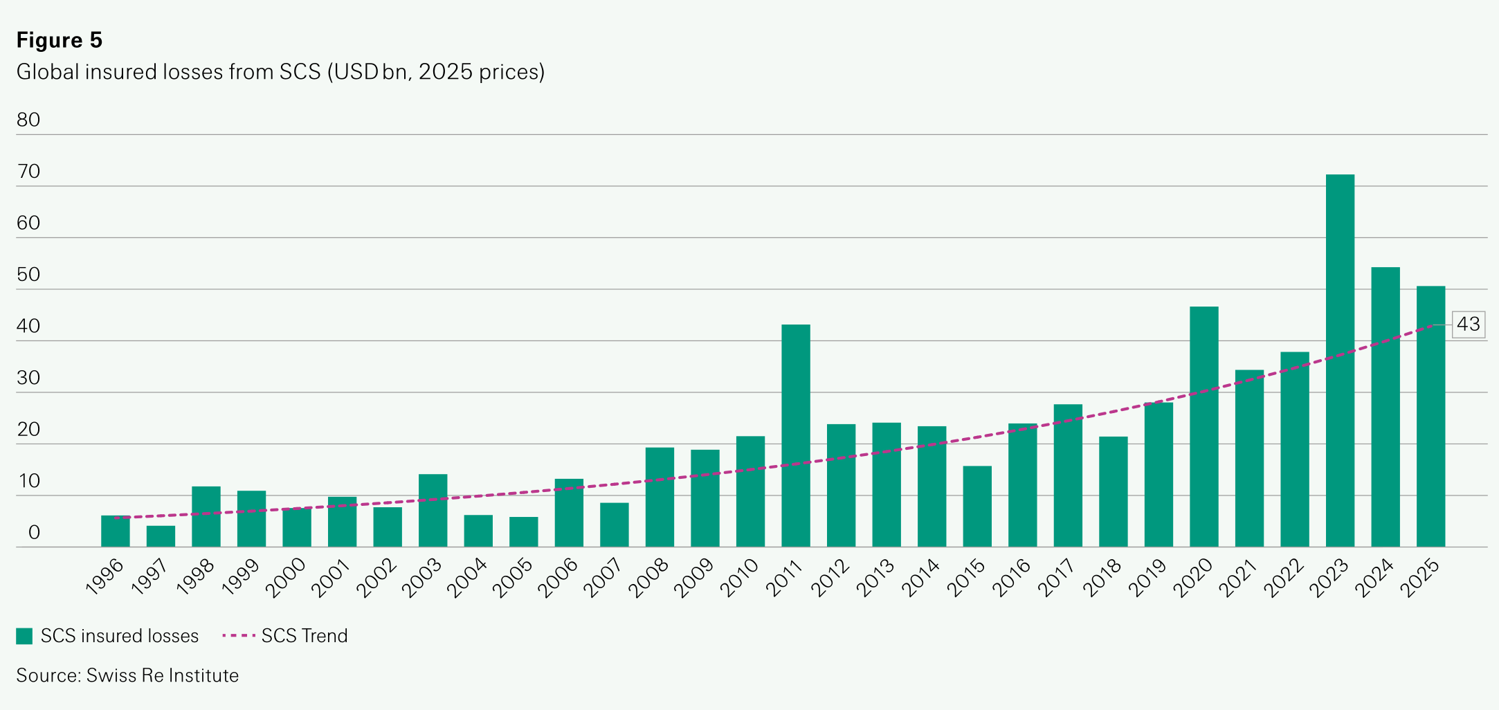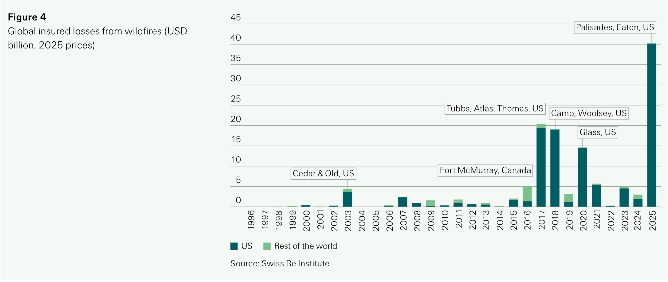 Herverzekeraar Swiss Re presenteerde eind maart hun rapport met een overzicht van schade door natuurrampen in 2025. De meest opmerkelijke grafiek uit het rapport is die met schade door natuurbranden. De verzekerde schade van die branden was in 2025 veel hoger dan ooit eerder het geval was, vooral door de enorme verwoesting van de Palisades bosbrand bij Los Angeles.