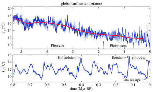 In september is er een artikel in Nature verschenen van de hand van Carolyn Snyder, getiteld “Evolution of global temperature over the past two million years”. In het artikel beschrijft zij een reconstructie van de mondiale temperatuur op aarde van de afgelopen 2 miljoen jaar, Snyder is daarmee de eerste die dat presteert. De grafiek hierboven vergelijkt haar temperatuurreconstructie met de gemeten opwarming vanaf 1880 en met de temperatuurprojecties tot het jaar 3000 volgens twee IPCC scenario’s, RCP6.0 en RCP8.5. Het RCP8.5 scenario is een soort business-as-usual scenario, oftewel: wat zal er gebeuren als we niets doen om onze CO2-emissies terug te dringen. Het RCP6.0 scenario is gebaseerd op een beperkte emissiereductie. Volgens de vergelijking van deze scenario’s met de temperatuurreconstructie van Snyder zullen we aan het einde van deze eeuw de temperatuurrange van het Pleistoceen (het tijdvak van circa 2,6 miljoen jaar – 12 duizend jaar geleden) zo ongeveer achter ons laten als we onze CO2-emissies niet intomen. Voor het jaar 3000 is dat zeer waarschijnlijk het geval, de temperatuur stijgt natuurlijk nog verder als de CO2-concentratie dan nog steeds toeneemt en dat is in beide projecties het geval.