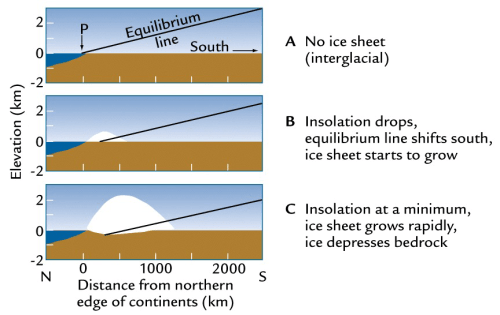 Figuur 1. Schematische weergave van het aangroeien van een ijskap op het noordelijk halfrond. De “Equilibrium line” is de grens tussen netto ijs-aangroei (boven de lijn) en -afname (onder de lijn). “P” is het zogenaamde climate point, het punt waar de equilibrium line het oppervlak raakt.
