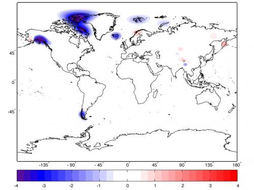 Veranderingen in ijsdikte (cm water equivalent/jaar) gedurende 2003-2010 zoals gemeten m.b.v. GRACE (exclusief Groenland en Antarctica).
