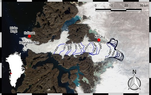 De Jakobshavn-gletsjer ligt aan de westkant van Groenland. Het fraaie radarbeeld hierboven uit 2015 (bron: ESA Sentinel-1A) laat duidelijk de rand van de gletsjer zien en het tientallen kilometers lange ijsfjord dat ongeveer loopt tot het plaatsje Ilulissat. Het ijsfjord staat op de Werelderfgoedlijst van UNESCO en is gevuld met ijsschotsen en ijsbergen afkomstig van de gletsjer (de ijsmassa die op het land ligt). De Jakobshavn-gletsjer is de snelst stromende gletsjer op dit grootste eiland ter wereld. De rand van de gletsjer, waar het ijs afbreekt en ijsbergen vormt (“calving front” in het plaatje hierboven), ligt nu ver landinwaarts, maar daar heeft hij natuurlijk niet altijd gelegen. De opwarming van de aarde heeft een grote uitwerking gehad op de lengte van de gletsjer zoals het plaatje hieronder laat zien (figuur 1 uit Steiger et al. 2018). In 1850 lag de rand van de gletsjer ongeveer halverwege het huidige ijsfjord en is hij met de jaren steeds verder landinwaarts komen te liggen. De laatste jaren is de stroomsnelheid van de Jakobshavn-gletsjer echter enigszins afgenomen en onlangs werd duidelijk dat de gletsjer weer gegroeid is en de rand van de gletsjer een beetje opgeschoven is richting Ilulissat.