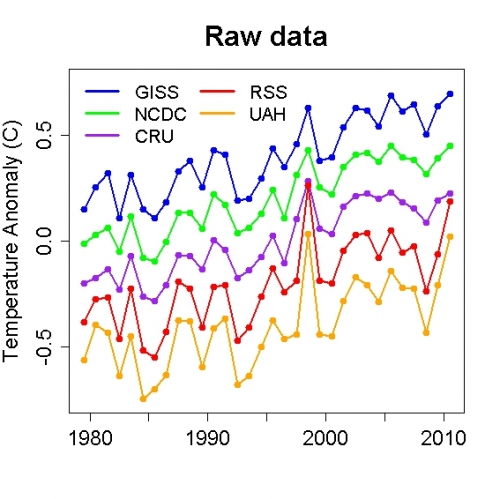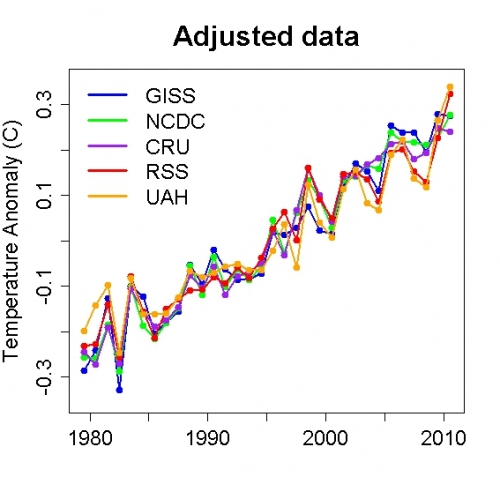 De maandelijkse waarden van de ‘gecorrigeerde’ globaal gemiddelde temperatuur vertonen nog steeds flinke pieken en dalen, maar alleen over korte tijdsschalen vanminder dan een jaar. Deze variaties zijn onderdeel van het chaotische element in ‘het weer’. Door de jaarlijkse waarden van de gemeten en de voor natuurlijke factoren gecorrigeerde opwarming met elkaar te vergelijken wordt duidelijk dat over meerdere jaren bekeken de opwarming gestaag aan het doorgaan is: