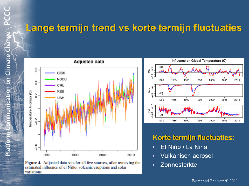 Ook in aanwezigheid van een lange termijn trend zijn er perioden van stagnerende temperatuur. Dat wordt ook door klimaatmodellen voorspeld, alleen kan de precieze timing ervan niet worden voorspeld (omdat de ENSO cyclus en vulkanen niet voorspelbaar zijn op tijdsschalen van meerdere jaren).