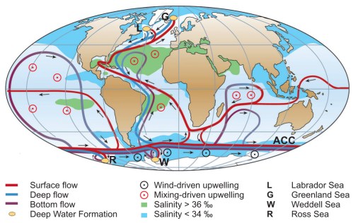 De oceaancirculatie op mondiale schaal, de thermohaliene circulatie, wordt onder meer aangedreven door koud water dat in de poolgebieden door zijn hoge soortelijke gewicht naar de zeebodem zinkt. De noordelijke Atlantische Oceaan, bij Groenland, is een plek waar veel water naar de diepte zinkt. Een belangrijke tak van de thermohaliene circulatie stroomt daar vandaan over de bodem naar het zuiden en vervolgens naar de Stille Oceaan. Op verschillende plekken in de Stille Oceaan komt het water, een tot twee millennia later, weer naar boven.