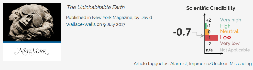 Op Climate Feedback becommentarieerden in totaal 17 wetenschappers het artikel van Wallace-Wells. Dat er inhoudelijk het nodige mis is, daar zijn ze het alle 17 wel over eens. Maar over de toonzetting verschillen de meningen flink. Dat is best een interessante constatering: de 17 klimaatwetenschappers die het – zeker in grote lijnen – eens zijn over de wetenschappelijke inhoud, hebben behoorlijk uiteenlopende ideeën over hoe je daar over zou kunnen of moeten schrijven. Het heeft ongetwijfeld te maken met hun risico-perceptie en met hoe die doorwerkt in de ideeën over hoe er over risico’s gecommuniceerd moet worden. Lees verder